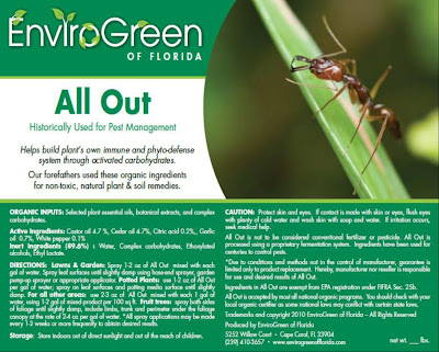 All Out is nature's way of keeping pests and insects OUT of your lawn and garden. It is not to be considered a conventional fertilizer or pesticide. By using All Out you aid your plants, lawn, garden, and crops in building a natural immune and phyto-defense system. In order to do this, All Out uses organic essential plant oils, complex carbohydrates, and adjunctive activated organic spring water molecules. To simplify this, All Out contains all natural occurring ingredients that have been used for centuries to control pests. Nature has a funny way of developing its own resources to defend from pests, bugs, and insects.